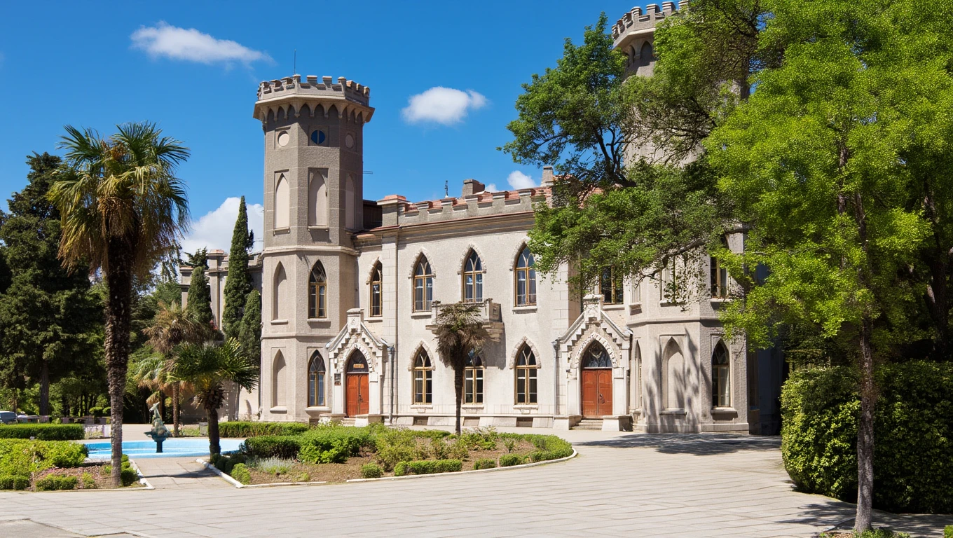 В Кореизе маршрут продолжает Юсуповский дворец — один из самых выразительных дворцовых ансамблей побережья. Рядом расположен Дюльбер с белыми фасадами и восточной архитектурой — силуэт, который запоминается с первого взгляда.