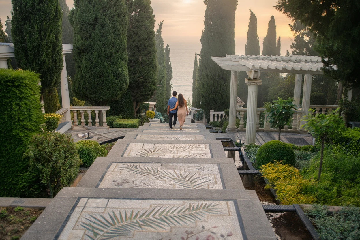 Начинать лучше с Японского сада — утренние сеансы дают мягкий свет, а людей значительно меньше. После Японского сада двигайтесь к смотровым площадкам с видом на Аю-Даг — здесь получаются самые масштабные, панорамные кадры.