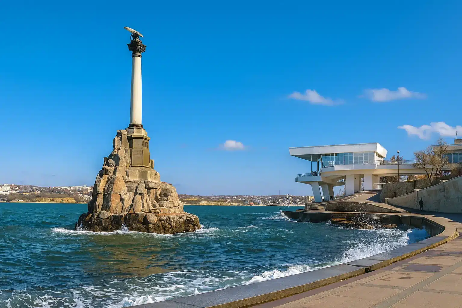 Монумент, признанный архитектурный символом Севастополя, состоит из двух частей. Первая расположена прямо в море в 20 метрах от берега, вторая – на набережной. Многим туристам очертания монумента кажутся очень знакомыми, и неудивительно: достопримечательность изображена на 200-рублевой купюре.